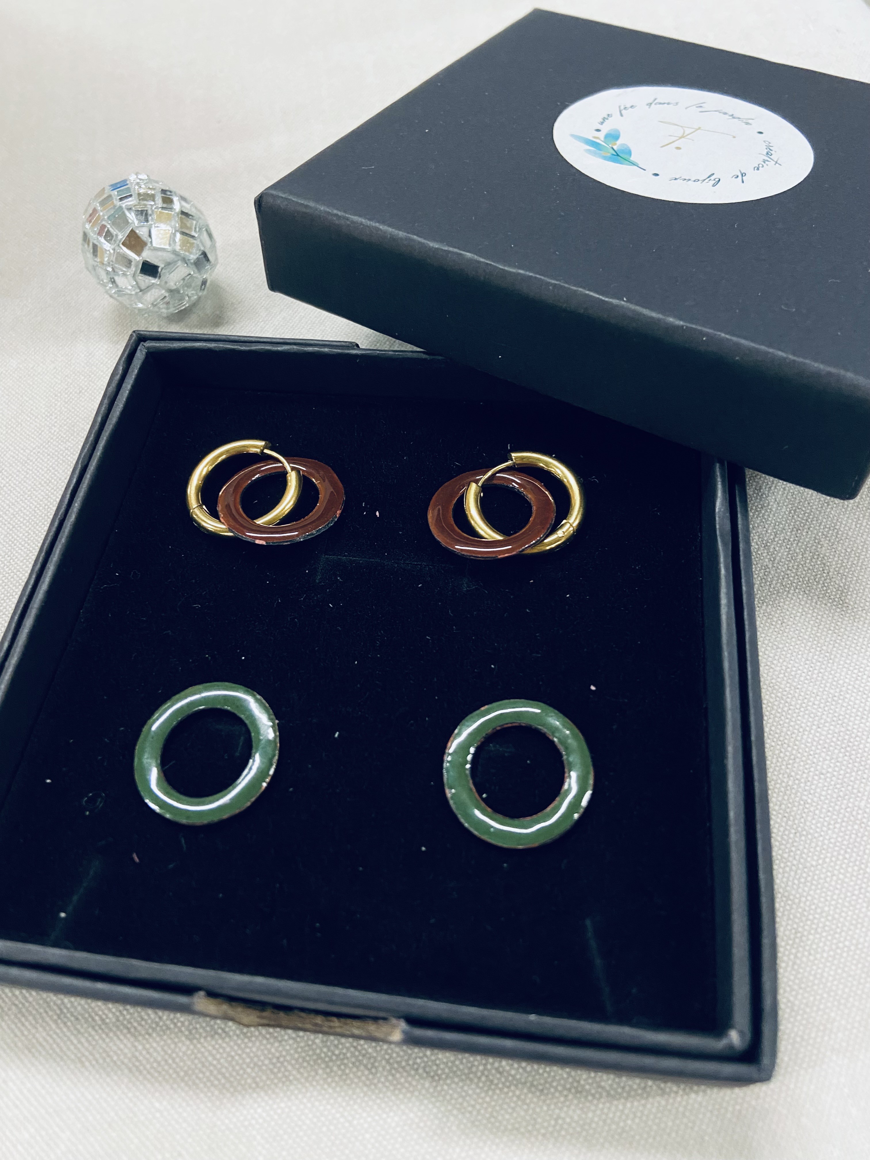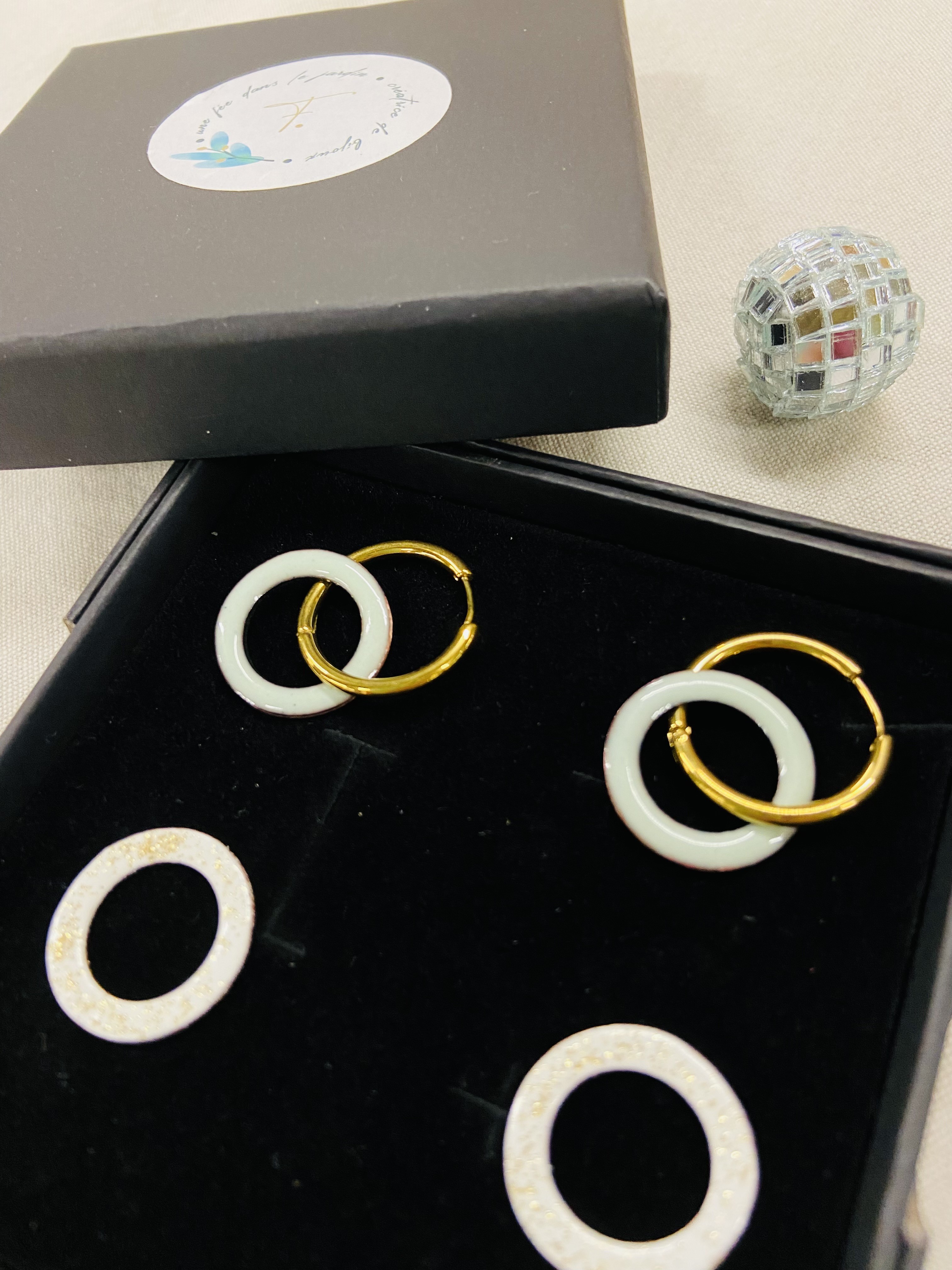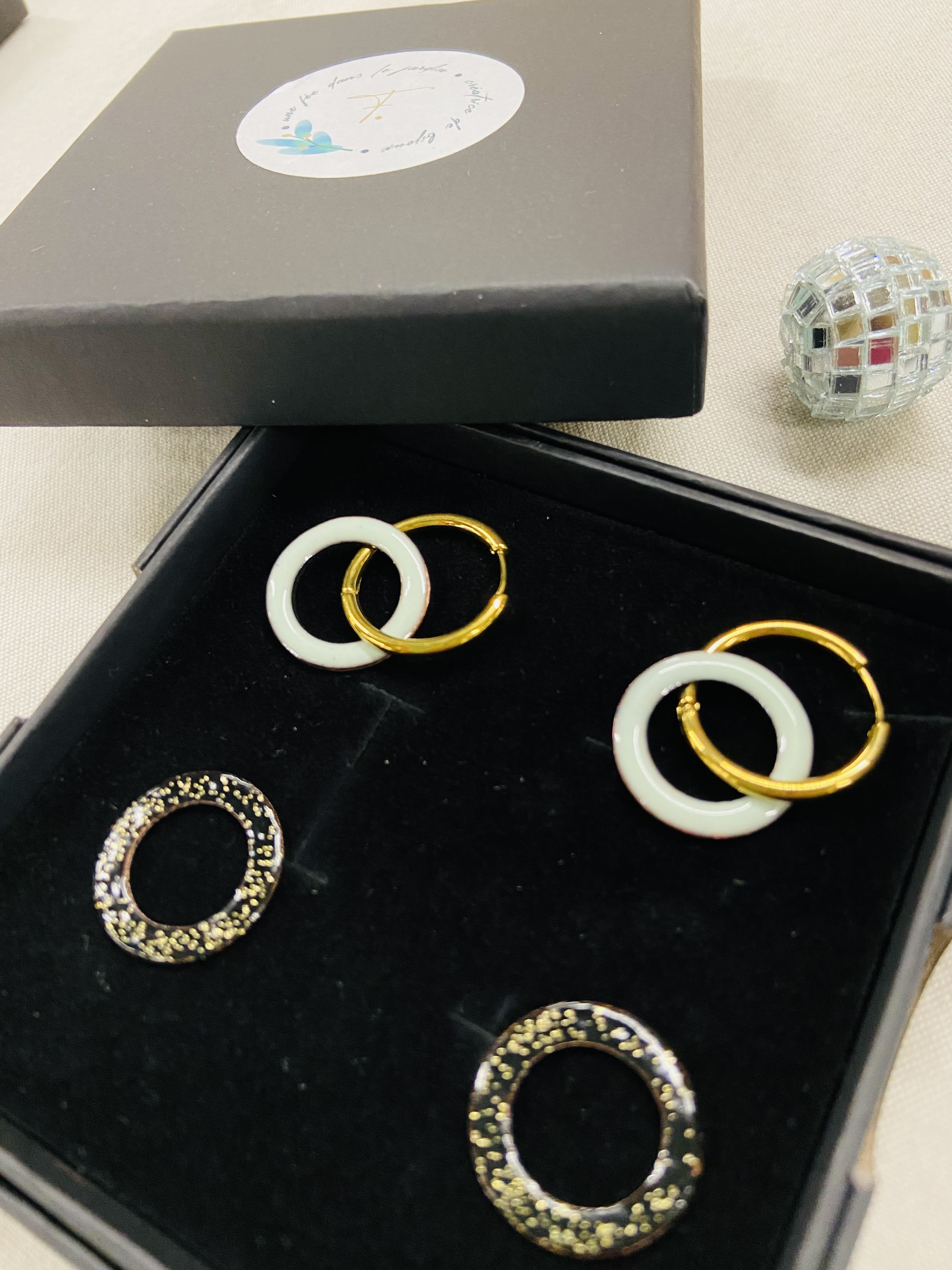 Ce joli coffret comprend les Boucles d’oreilles créoles interchangeables avec anneaux émaillés à la main dans mon atelier pour un fini unique .