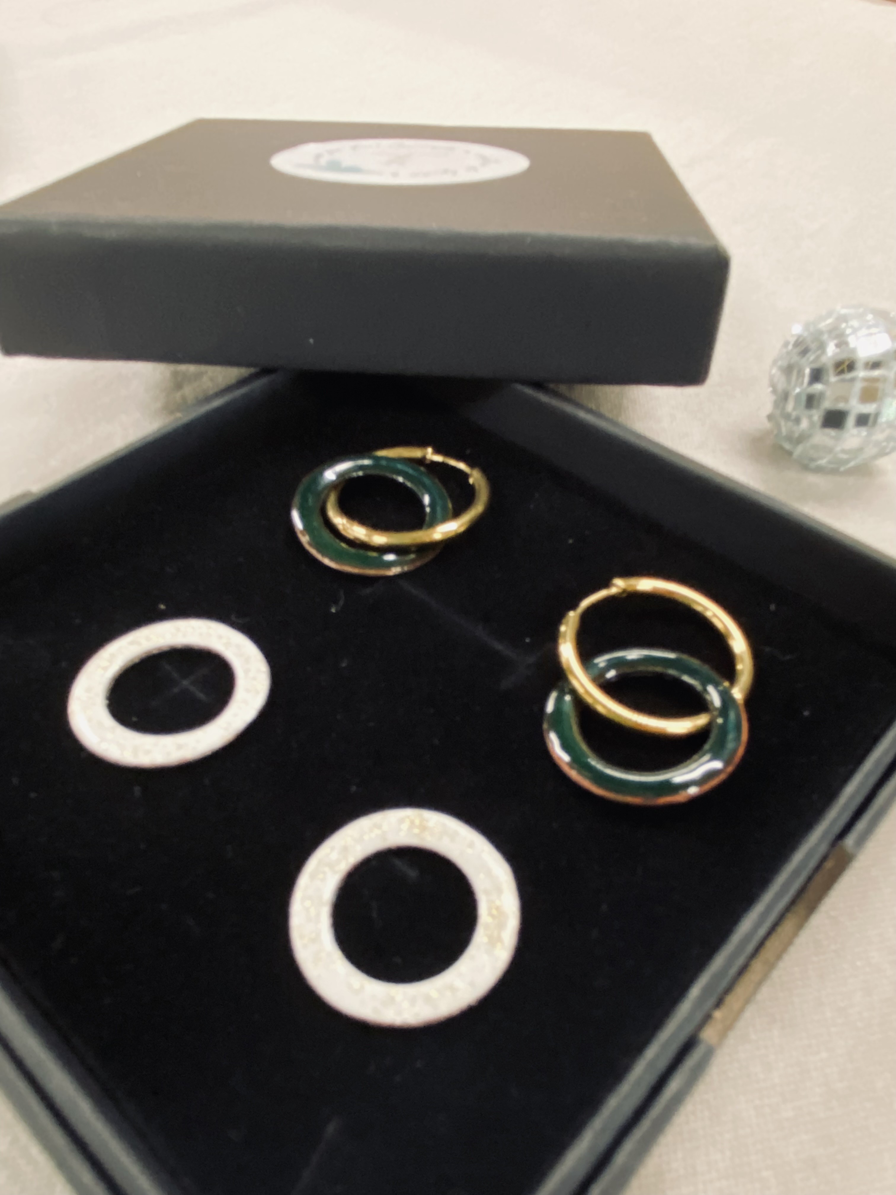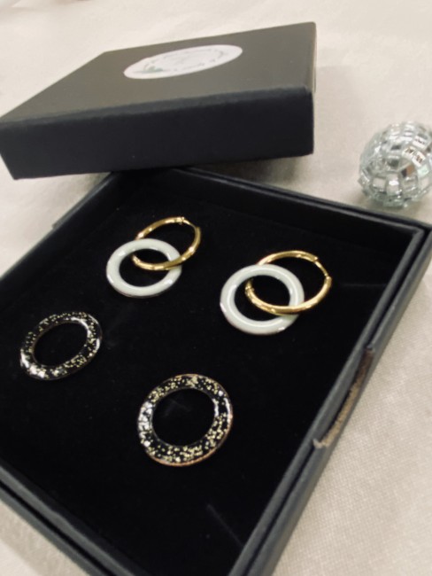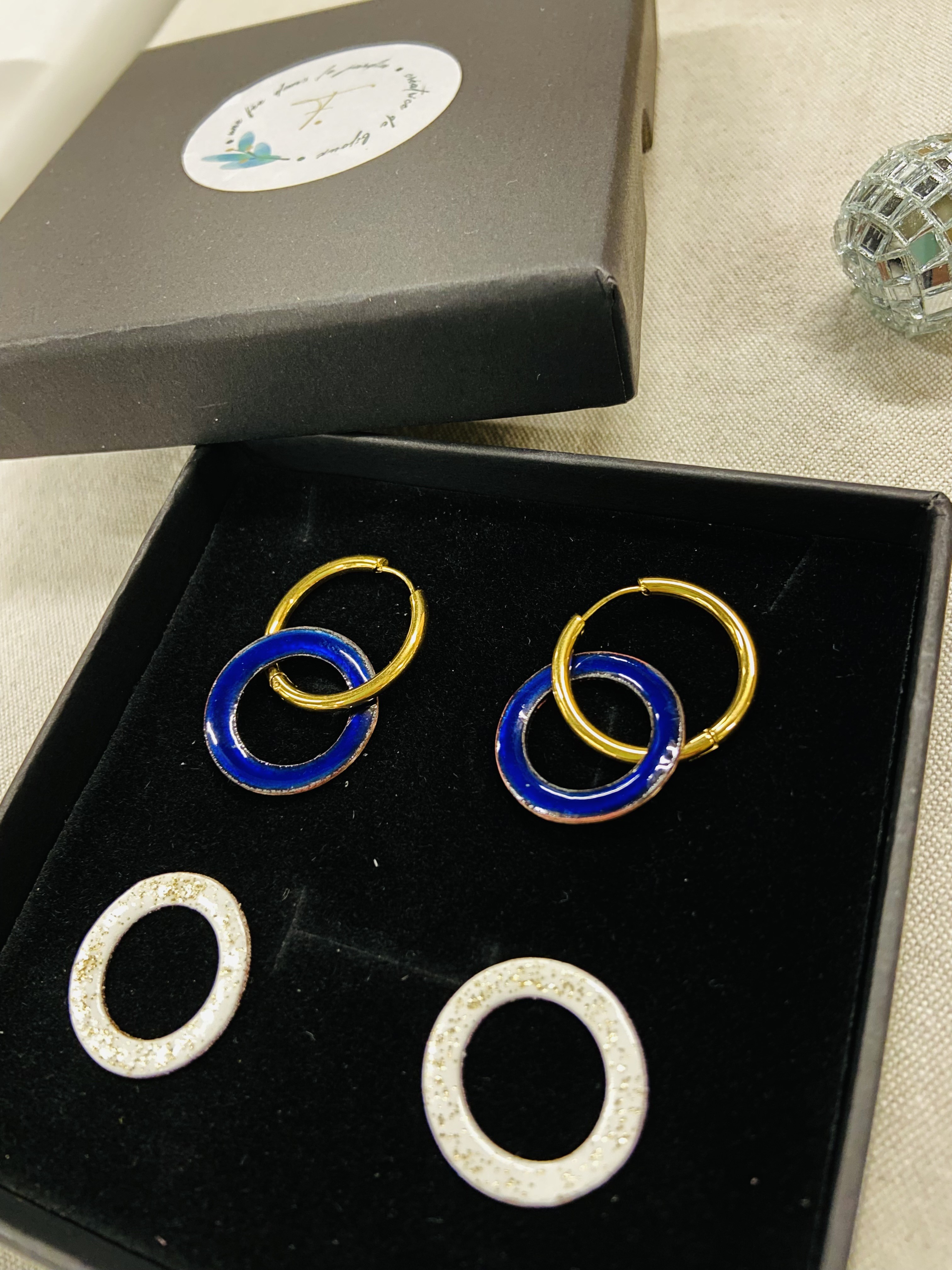 Ce joli coffret comprend les Boucles d’oreilles créoles interchangeables avec anneaux émaillés à la main dans mon atelier pour un fini unique .