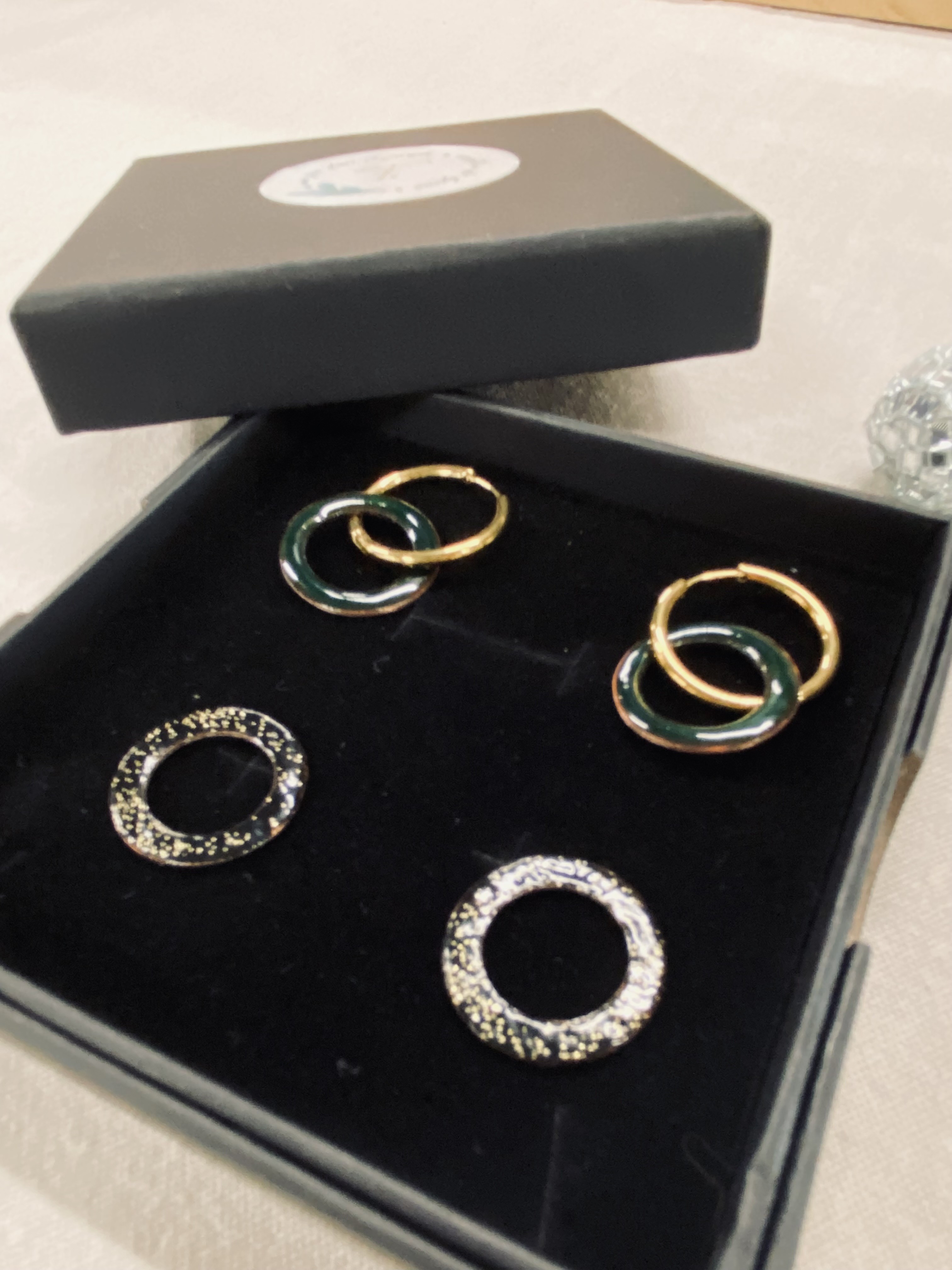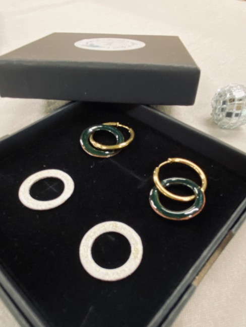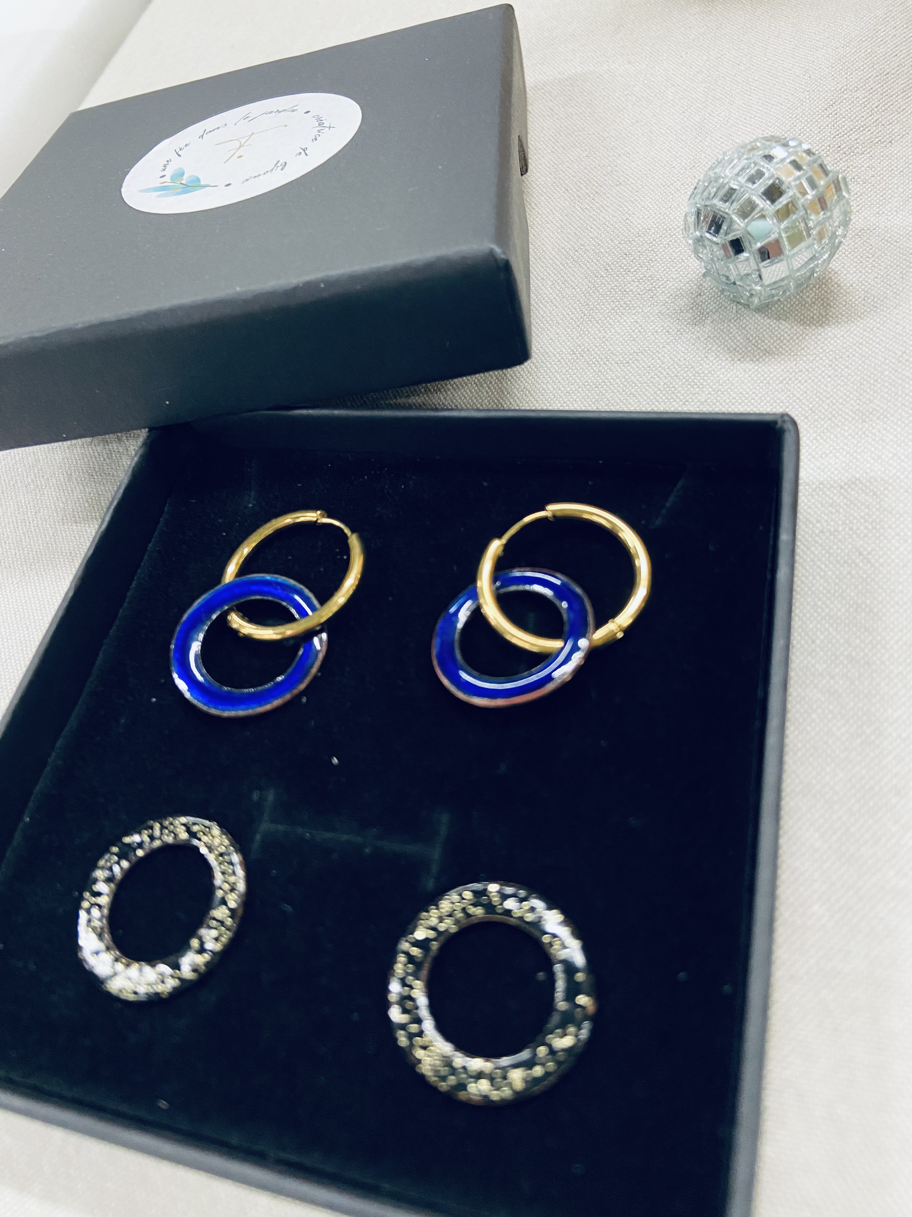 - ainsi qu’une seconde paire d’anneaux émaillés à la main (diamètre : 1,7cm )