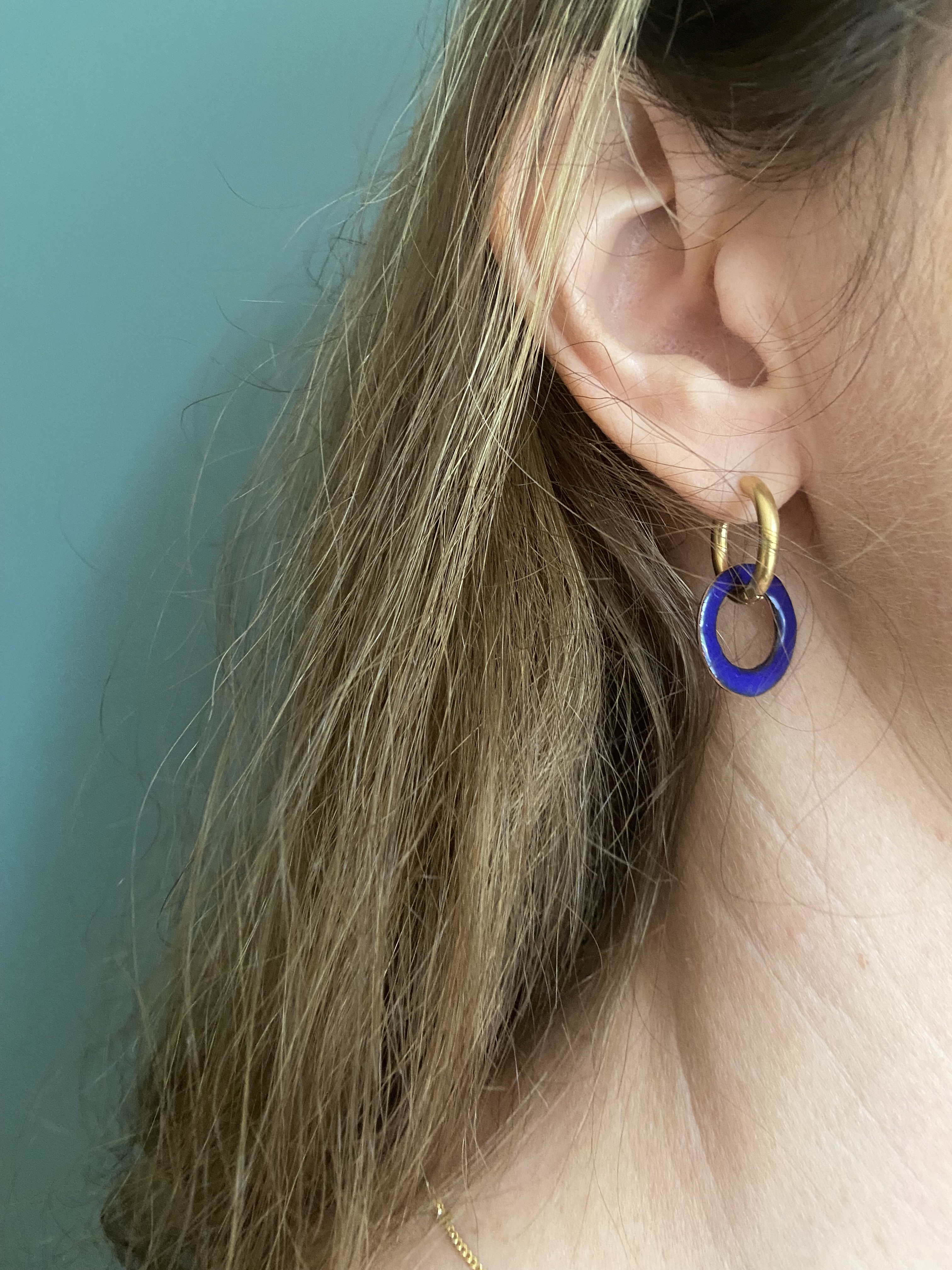 - une paire de créoles dorées en acier inoxydable hypoallergénique (diamètre : 2 cm) et des anneaux émaillés de diamètre 1,7 cm.