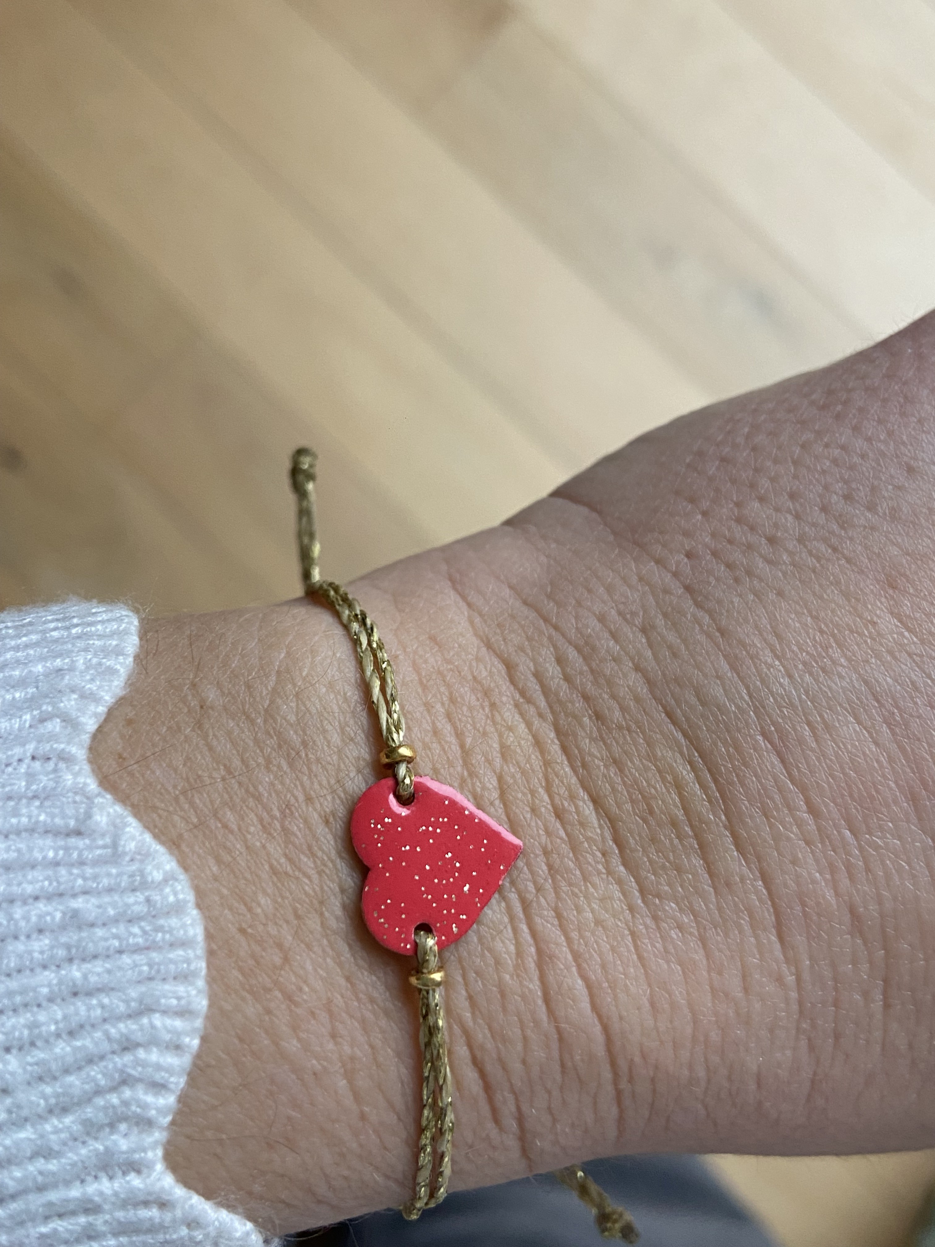 -un bracelet coeur unique émaillé (couleur au choix : émeraude , rouge, blanc) ajustable par un noeud coulissant (s'adapte à tous les poignets)